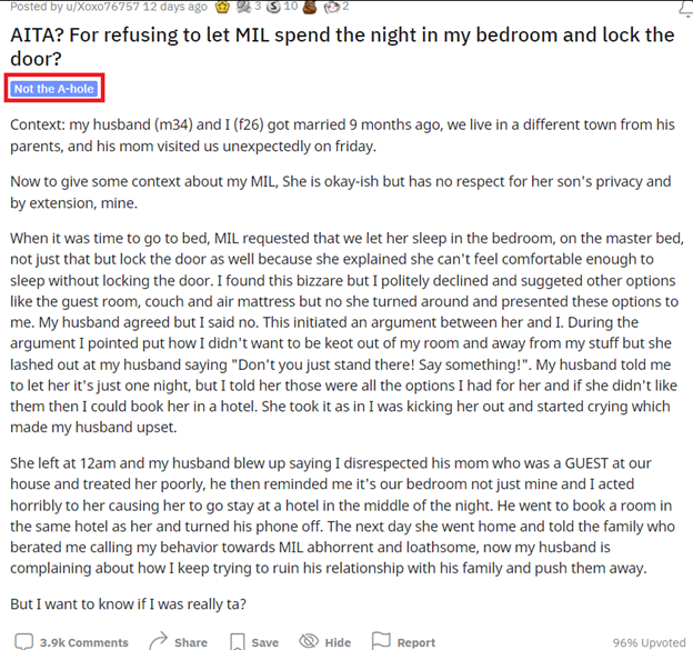 Things took a weird turn when the MIL asked to sleep in the master bedroom alone. She insisted on locking the door for whatever funny business she needed to do in privacy while invading her daughter-in-law’s privacy.