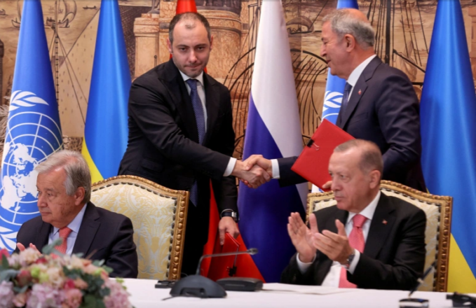 The signing ceremony was held in Istanbul, however, neither side sat at the same table. Sergei Shoigu, the Russian minister of defence, was the first to sign the agreement for Moscow, and Oleksandr Kubrakov. The Ukrainian minister of infrastructure was the second.