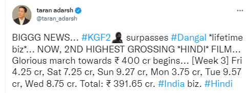 The release of the Kannada movie KGF Chapter 2 has made the public rush towards the cinema in a short time. The film received mixed reviews across India, but it was generally thought to be a step forward from its predecessors. It is also known as the first Kannada movie to be released in IMAX. One to surpass the all-time famous film Dangal by Amir Khan. The main star Yash receives praise along with all the script, production, and direction. Trade analyst Taran Adarsh has tweeted about the success of the film saying.
